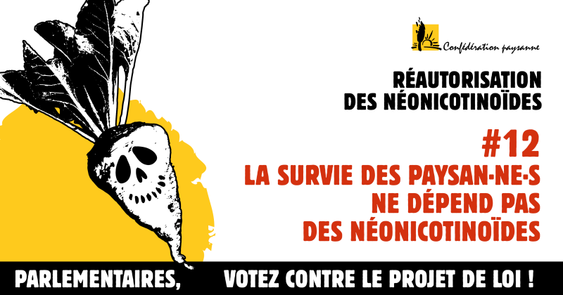 Un insecticide dont la dangerosité a été largement documentée. A cette occasion, la Confédération paysanne a présenté à la presse un document de décryptage. Après l'Assemblée nationale, le Sénat s'apprête à valider demain cette réautorisation. En téléchargement : Décryptage